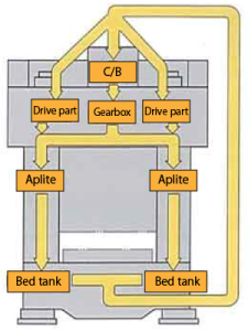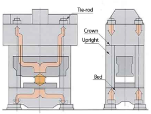 In order to minimize die-height-deviation, heated lubrication oil is circulated through the column to stabilize extension of frame and drive unit.