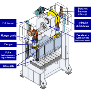 High rigidity eccentric shaft minimizes the clearances of drive unit. Plunger guide and 8-face gibs maintain parallelism and horizontal accuracy of slide for extends die life.